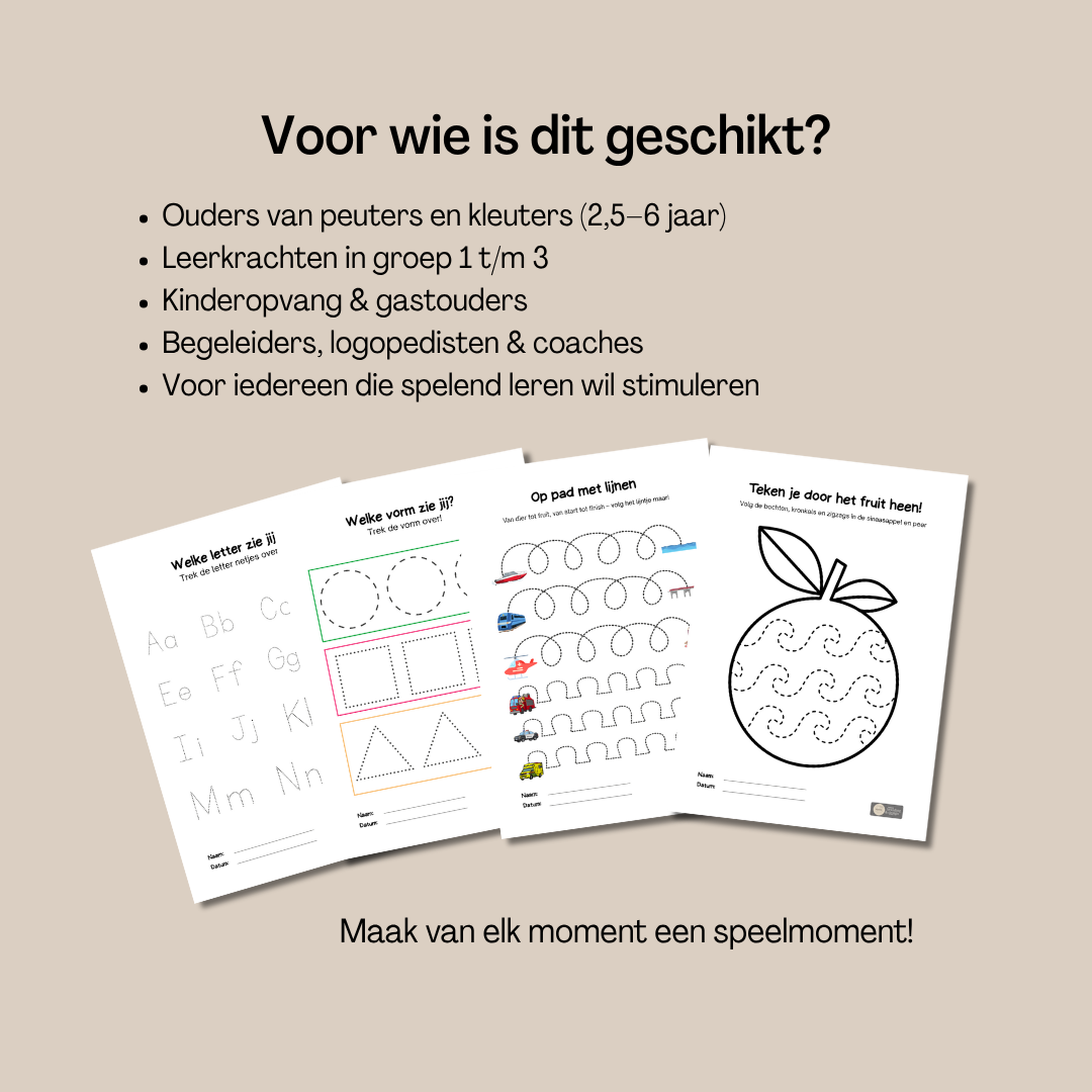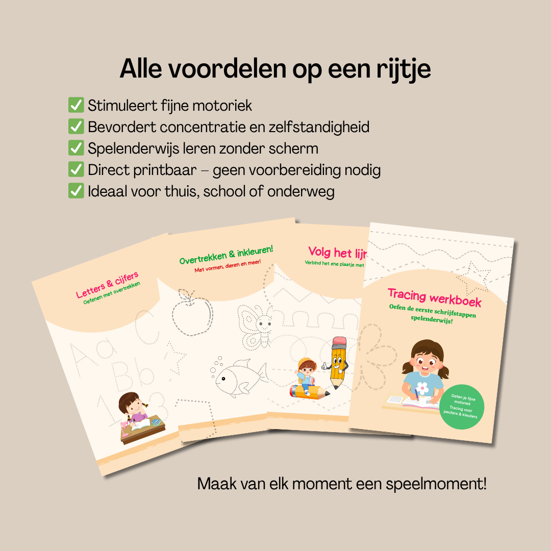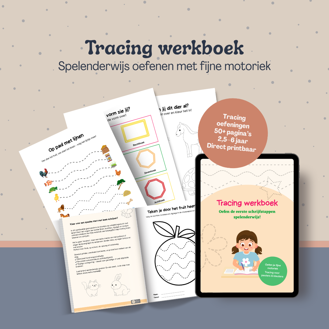 Kinderen die regelmatig tracen, herkennen patronen, vormen en letterstructuren sneller. Dat maakt de overstap naar echte schrijfletters en cijfers een stuk makkelijker en minder frustrerend.